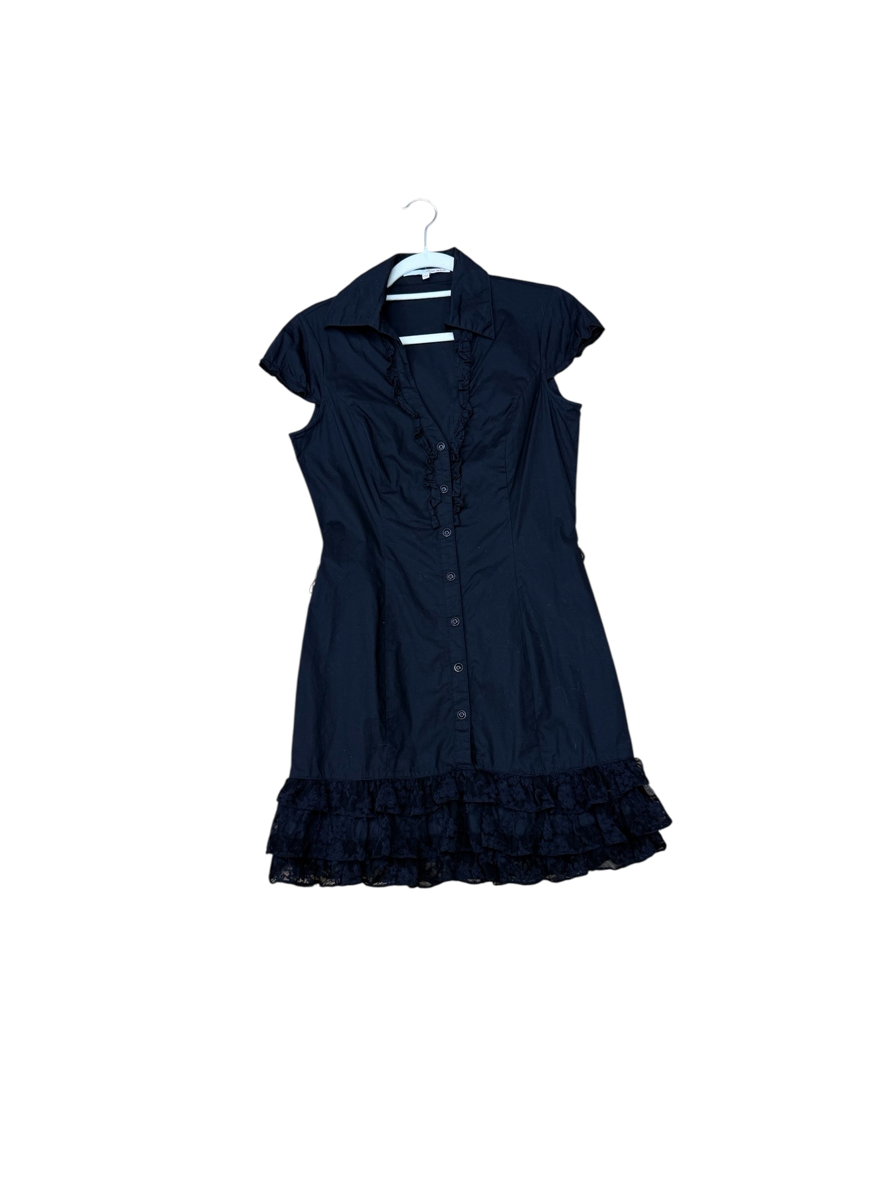 Vestido negro de segunda mano con un diseño femenino y elegante, ideal para looks versátiles que transitan entre el día y la noche. Su silueta entallada realza la figura, mientras que el cuello camisero y la botonadura frontal aportan un toque clásico y atemporal.
