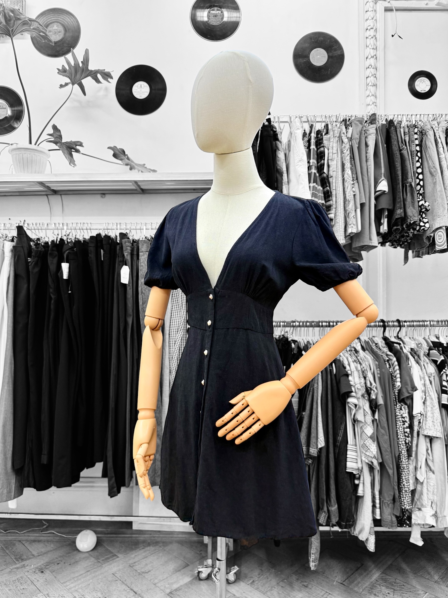 Este vestido negro de segunda mano destaca por su escote en V profundo, botones frontales y mangas cortas ligeramente abullonadas, que aportan una silueta delicada y favorecedora.